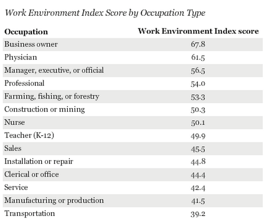 Despite earning top marks in most areas of wellbeing, teachers’ answers to various questions about their workplace produces a 49.9 Work Environment Index score, which is eighth out of 14 occupation groups. The nation’s educators rank sixth in saying their “supervisor treats me more like a partner than a boss.” And they are dead-last –14th — in saying their “supervisor always creates an environment that is trusting and open.”