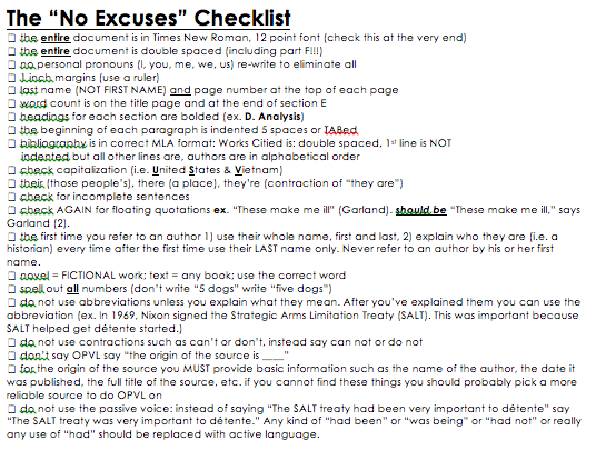 There is a moment in my teaching career I have been mulling over recently. It was  Spring and I’d just passed back feedback for the big research papers my students were writing. Before students turned in their papers I passed out a “No Excuses” checklist (see below) and told them that if any of the items on the list were missing I would immediately stop reading their paper and return it to them to correct. They would then receive a consequence for having submitted a late paper.