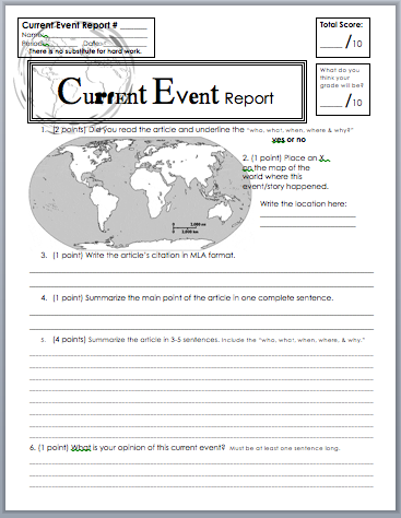 Many local newspapers have free or near-free subscription offers for schools. I often get a class set of 30 subscriptions and have students cut out (or print out) articles and attach them to the back of this form (Current Event Report form) in order to show that they annotated the article. Having a stack of newspapers is also a great enrichment tool for students who finish early.