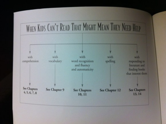 - It has a cheat-sheet inside the front cover so you don’t have to read it all: If you’re anything like me, sometimes you freak out because you teach 12th grade and one of your students appears to actually not be able to comprehend what he/she reads. Never fear! Simply use the handy little flowchart at the front of the book (see below) and turn to the chapter you need.