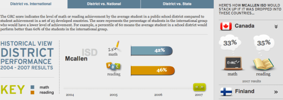 The George W. Bush presidential library has an interesting (although, really over simplified) tool that enables you to compare average math and reading exam results for any public school district (both charter and traditional) with state, national and international figures (see above for an example of my hometown compared internationally). This tool is called “The Global Report Card” and is fun to play around with; but keep in mind that in addition to being a cool little application, the site is definitely promoting a pro-reform agenda.
