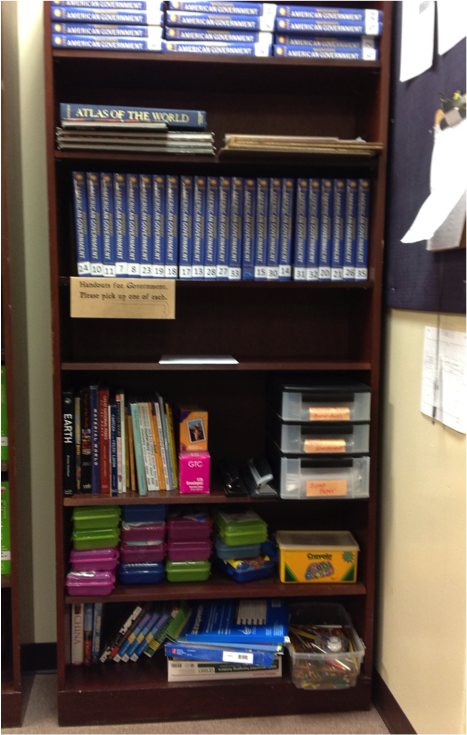 With super limited space this year, I don’t have a table for handouts, but rather an empty shelf. In addition, I leave student supplies on the same bookcase with easy access for students to get to the materials they need.