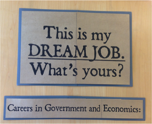 There are two signs that I’ve had up in my room every year since Abby gave me the brilliant idea… “This is my Dream Job. What’s yours?” and “Yes, I really do love you.” It’s incredible how many times students have referenced these two signs when I talk to them about our class years later. They are very empowering messages. And, I love to shamelessly promote careers related to the class I’m teaching, so the rest of the wall includes a list of jobs that this class might lead toward.