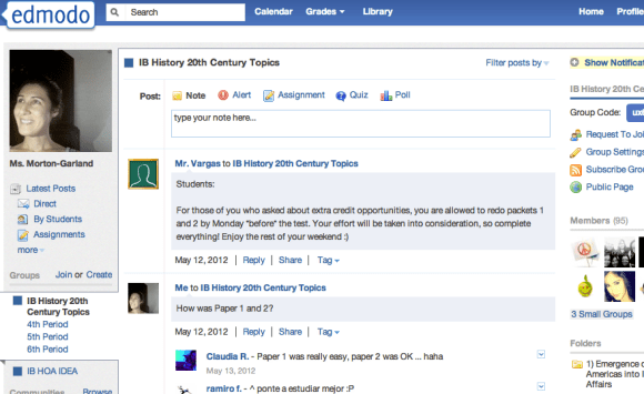 • Edomodo helped me do some “front-loading” or “flipped classroom” instruction where students learned for homework (watched a history video online, explored a website, did their own research) and then came to class ready to discuss/write/practice in some way the material they learned for homework.